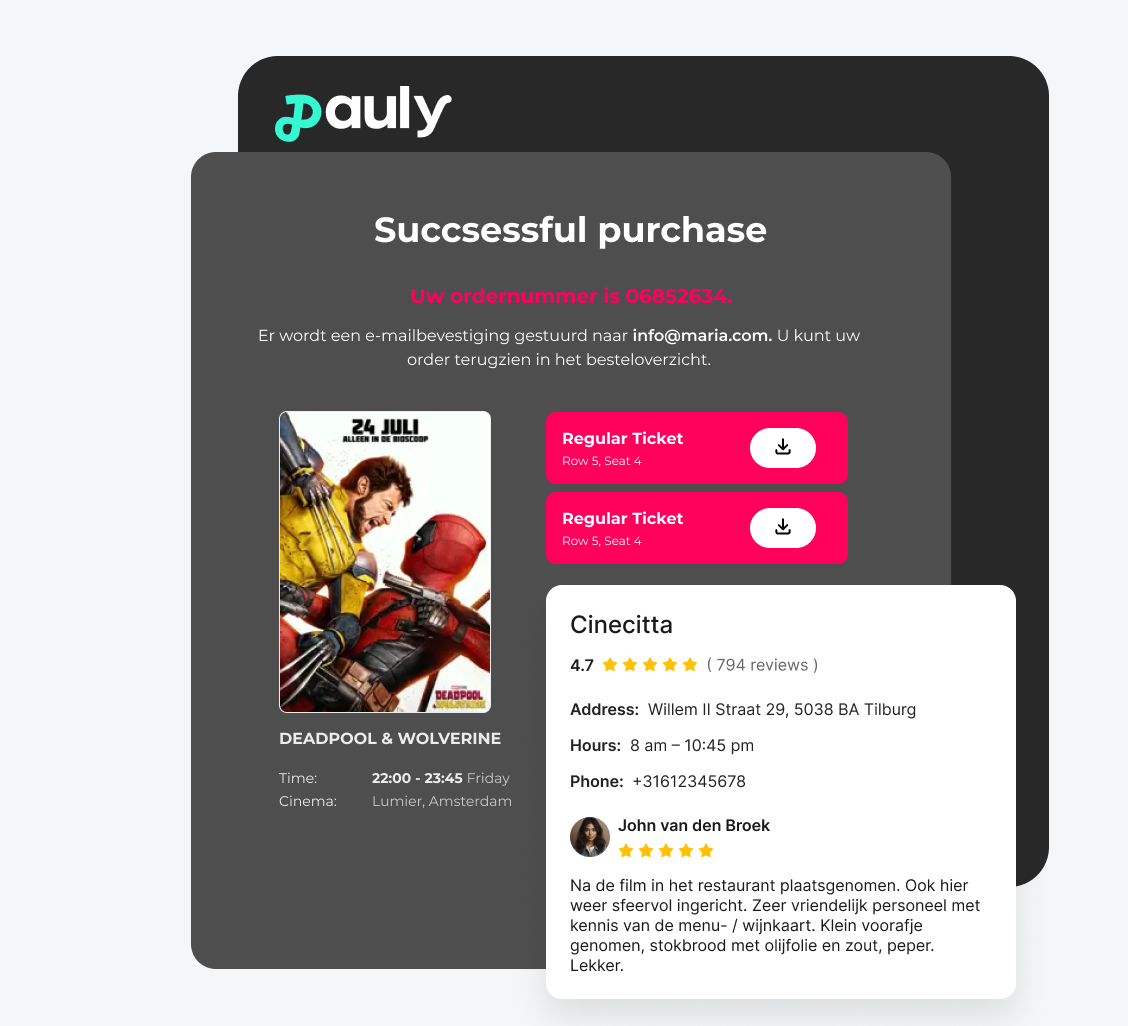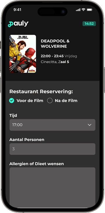 Met Pauly bied je horeca en arrangementen aan op het juiste moment in de bezoekersflow. Drankjes, snacks of combinaties worden vooraf of tijdens het reserveren aangeboden, passend bij de film en het tijdstip.