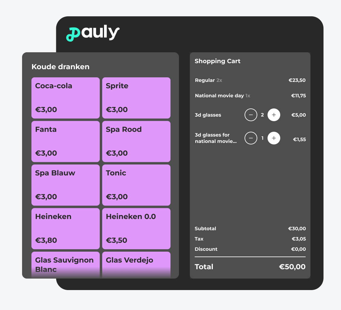 De kassa binnen Pauly werkt naadloos samen met ticketing, horeca en programmering. Prijswijzigingen en aanpassingen worden automatisch doorvertaald, zodat medewerkers nooit hoeven te twijfelen wat geldt.